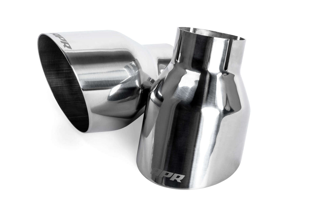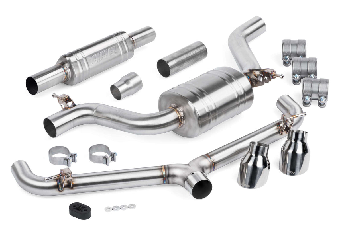 The APR Catback Exhaust System personalizes your vehicle's looks, sound and performance. Beautifully hand-crafted T304-stainless-steel components adorn the system with stunning TIG-welding throughout. Our straight-through brushed-finished mufflers are configurable to your desire, smoothing the exhaust note to a deep growl, without adding restrictions, rasp or drone. Strong high-quality bracketry and OEM-style clamps hold the system steadily in place, making the install or removal a snap, and fitment simple, yet precise. A cast 3" to dual 2.5" rear splitter creates an ultra-smooth transition, steadily feeding exhaust gasses out of the system, while looking tidy from under the rear bumper. Finally, removable 4" polished slash-cut exhaust tips finish the system, adding a classy motorsport-inspired touch to the rear of the vehicle.