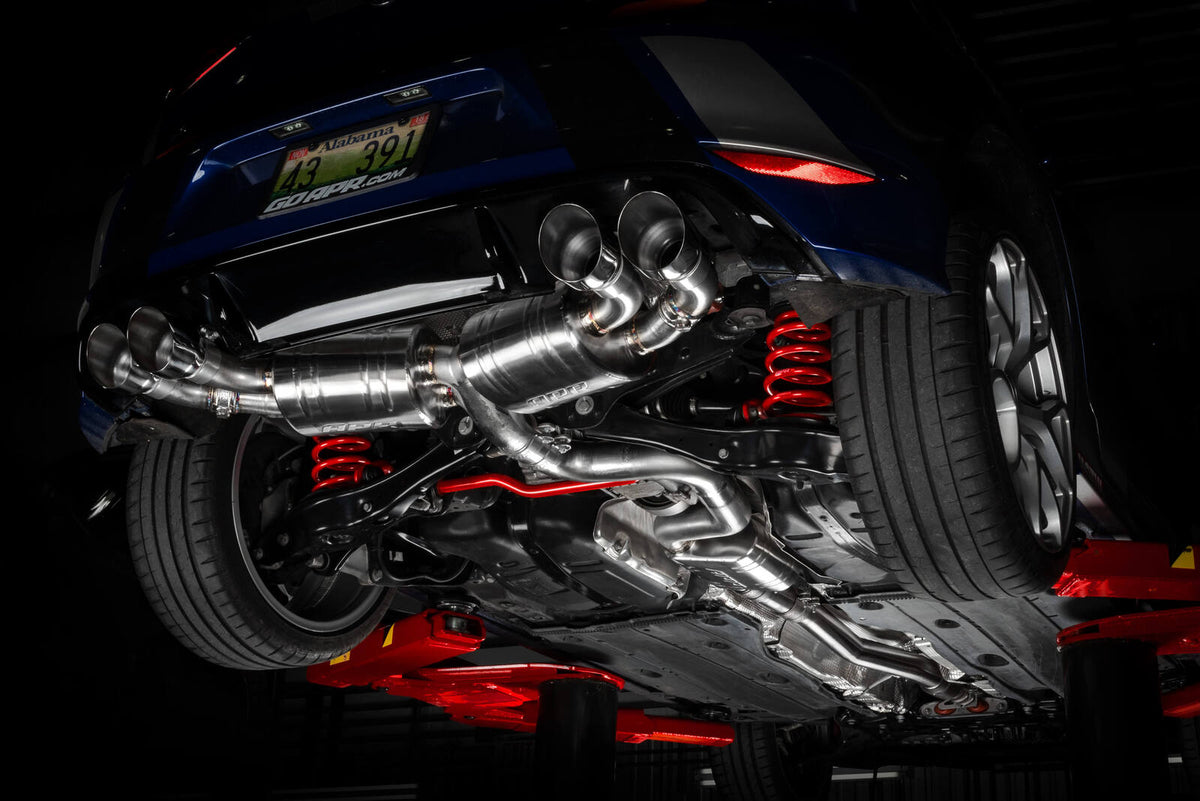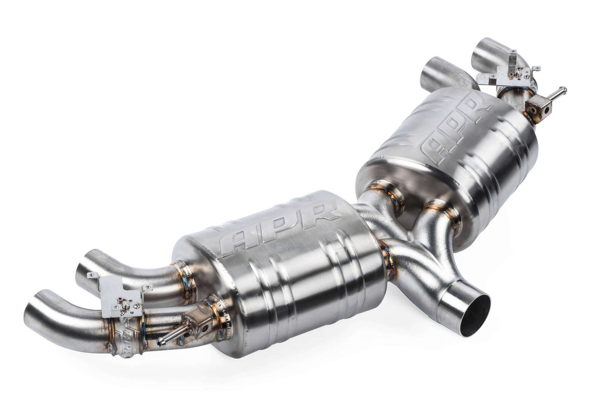 The APR Catback Exhaust System personalizes your vehicle's looks, sound and performance. Beautifully hand-crafted T304-stainless-steel components adorn the system with stunning TIG-welding throughout. Our straight-through brushed-finished mufflers smooth the exhaust note to a deep growl, without adding restrictions, while our Helmholtz resonator reduces unwanted frequencies. Strong high-quality bracketry and OEM-style clamps hold the system steadily in place, making the install or removal a snap, and fitment simple, yet precise. A cast 3" to quad 2.5" rear splitter creates an ultra-smooth transition, steadily feeding exhaust gasses out of the system, while looking tidy from under the rear bumper. Our cast valve housings enable the vehicle to be fitted with the factory electronic valve actuators, retaining OEM valve operation. Finally, removable 4" polished slash-cut exhaust tips finish the system, adding a classy motorsport-inspired touch to the rear of the vehicle.
