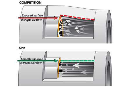 This system includes both intercooler hoses. APR's Engineers took a multi-step approach to optimizing the hoses to minimize boost leaks, reduce turbulence and other performance degradations. Four-ply silicone was utilized as it provides the thickness and strength characteristics necessary to support boost levels far beyond the engine's capabilities. A Fluorosilicone internal lining was added to ensure the hoses do not rapidly deteriorate over time when exposed to oil and gasoline from the PCV and EVAP systems. The included stainless-steel Clampco T-bolt clamps prevent the hoses from coming loose under heavy pressure and under high temperatures, silicone adheres to its mating surface, further minimizing leaks and hose slippage. APR's EZ-Flow stepped design creates a smooth airflow path, reducing turbulence over non-stepped designs. Finally, silicone provides better heat resistance over rubber, extending the life of the product and ultimate