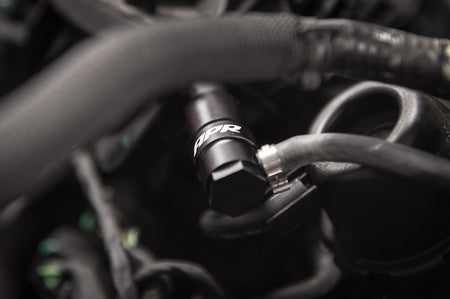 Utilizing the included punch tool on a warm engine, a boost and vacuum reference port is easily spread opened on the factory intake manifold. The billet aluminum boost tap then connects to the port and uses dual Viton o-ring seals for leak free operation. The reference hoses connect to the rear of the tap via a barbed stainless steel connection point and conveniently routes through the engine bay.