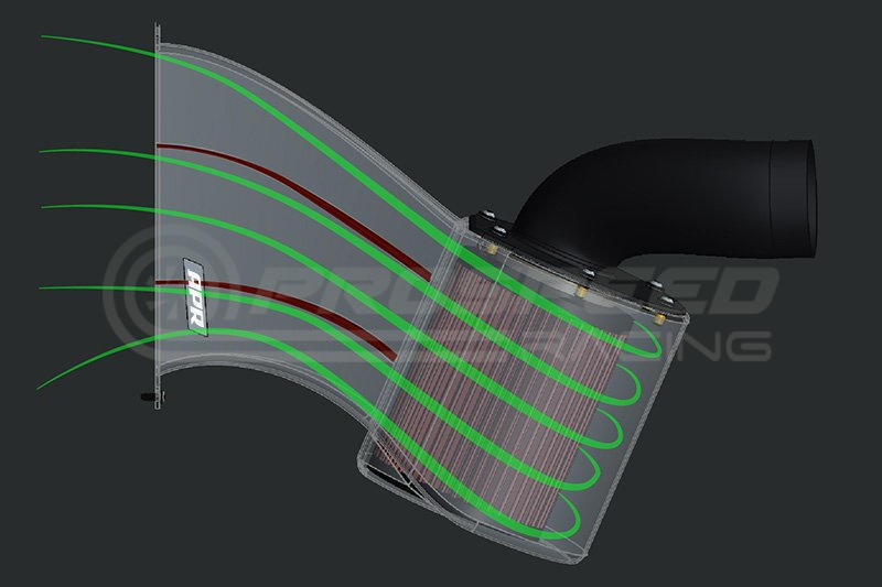 Flow disruptions and turbulence ultimately impede airflow to and from the intake filter, resulting in a performance loss. The APR Intake system takes a two-step approach to improving mass airflow in this region. As air enters the intake entrance, directional vanes ensure airflow is properly directed towards the entire length of the intake filter rather than only a small portion. This results in a reduction of air turbulence and creates an even pressure distribution over the entire filter surface for maximum filter efficiency.
