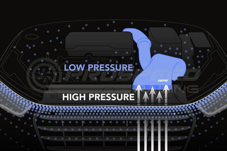 Unlike traditional open element filters, the APR intake design only pulls air from the grille area near the leading edge of the vehicle’s hood. In doing so, it draws air from an area of relatively high pressure. As the vehicle increases in speed, pressure continues to build and ultimately aids in the intake’s effectiveness. By sealing the intake system, pressure created during the ram air effect and volute design is not simply lost within the engine bay. This is contrary to open element filters that pull air from a relatively low pressure region formed within the engine bay.