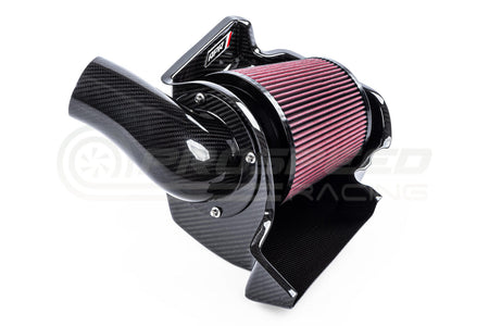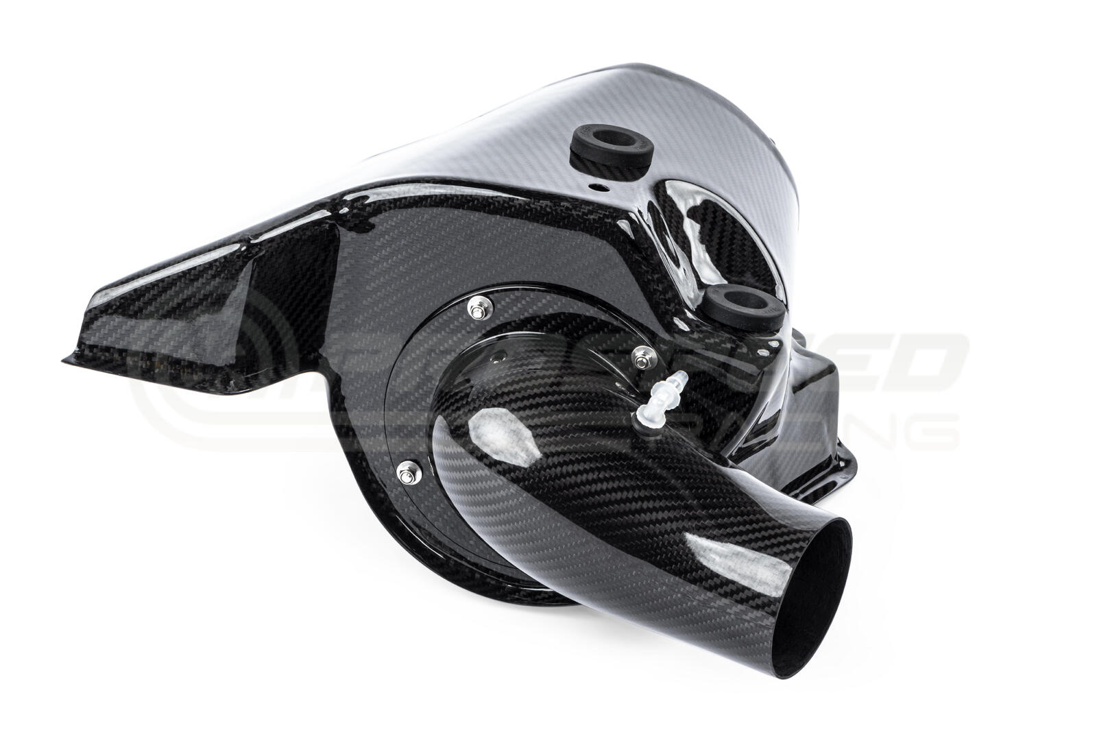 Our beautiful carbon fiber intake system does away with the closed airbox design and uses a massive 7" washable and reusable cotton filter with a frontal inlet and 4" rear outlet. This was necessary to limit pressure drop across the factory system and maximize airflow, while allowing you to fully hear the engine breathe! The massive filter provides excellent filtration. By oversizing the filter, we're able to limit pressure drop without sacrificing filtration. This is made possible through the use of greatly increased filter surface area. Carbon fiber not only looks great, but it allows us to make a complex and organic heat shield shape that keeps hot air pushed through the frontal radiator away from the intake tract. Furthermore carbon fiber allows us to limit wall thickness on the intake pipe, maximizing the pipe's internal diameter and thus airflow. Lastly, carbon fiber retains heat less than other materials, such as metal, making it ideal for performance.