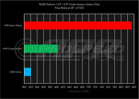 The full factory system brings this down to 275 CFM, or 31% less. The full APR System (Open airbox, rear pipe, and turbo inlet pipe), bring this down to 345 CFM, which is only 13% less, or a 25% improvement over stock! This directly translates to more power you can feel. Our full bolt on APR Tuned S3 saw max gains of 12 AWHP and 13 AWFT-LBS of torque using the full intake system compared to stock! These are solid gains that make a noticeable difference in performance!