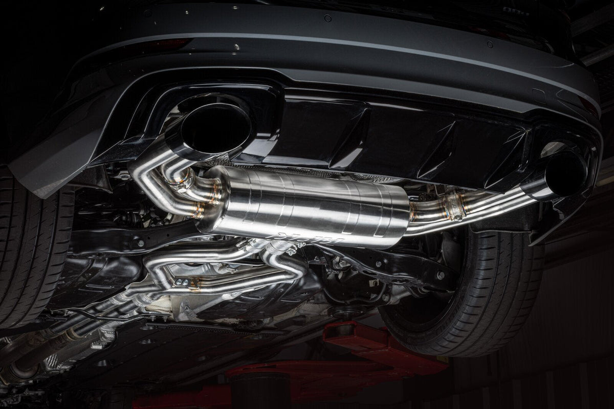 The APR Catback Exhaust System personalizes your vehicle's looks, sound and performance. Beautifully hand-crafted T304-stainless-steel components adorn the system with stunning TIG-welding throughout. Our straight-through brushed-finished mufflers smooth the exhaust note to a deep growl, without adding restrictions or rasp. Strong high-quality bracketry and OEM-style clamps hold the system steadily in place, making the install or removal a snap, and fitment simple, yet precise. Dual 2.5" mandrel-bent exhaust paths provide an ultra-smooth path, steadily feeding exhaust gasses out of the quad exit system, while looking tidy from under the rear bumper. Our cast valve housings enable the vehicle to be fitted with the factory electronic valve actuators, retaining OEM valve operation for variable sound levels. Finally, our 170x112mm ovalized diamond black exhaust tips finish the system, adding a classy RS-inspired touch to the rear of the vehicle.