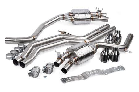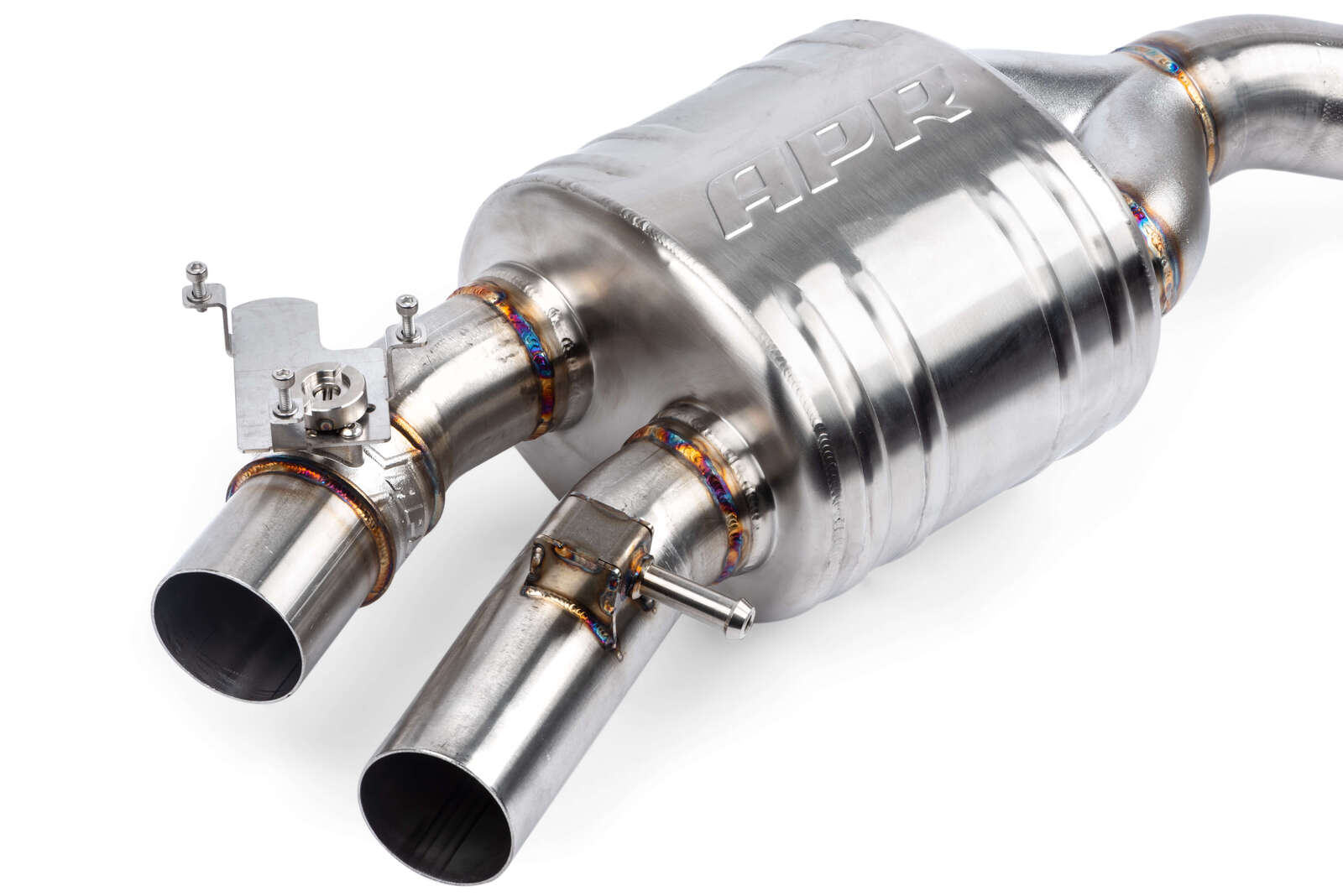 The APR Catback Exhaust System personalizes your vehicle's looks, sound and performance. Beautifully hand-crafted T304-stainless-steel components adorn the system with stunning TIG-welding throughout. Our straight-through brushed-finished mufflers smooth the exhaust note to a deep growl, without adding restrictions. Strong high-quality bracketry and OEM-style clamps hold the system steadily in place, making the install or removal a snap, and fitment simple, yet precise. Cast 2.75" to dual 2.5" rear splitter creates an ultra-smooth transition, steadily feeding exhaust gasses out of the system. Our cast valve housings enable the vehicle to be fitted with the factory electronic valve actuators, retaining OEM valve operation. Finally, removable 4" polished slash-cut exhaust tips finish the system, adding a classy motorsport-inspired touch to the rear of the vehicle. Optional tip upgrades, and an optional center muffler / Center muffler delete is available.