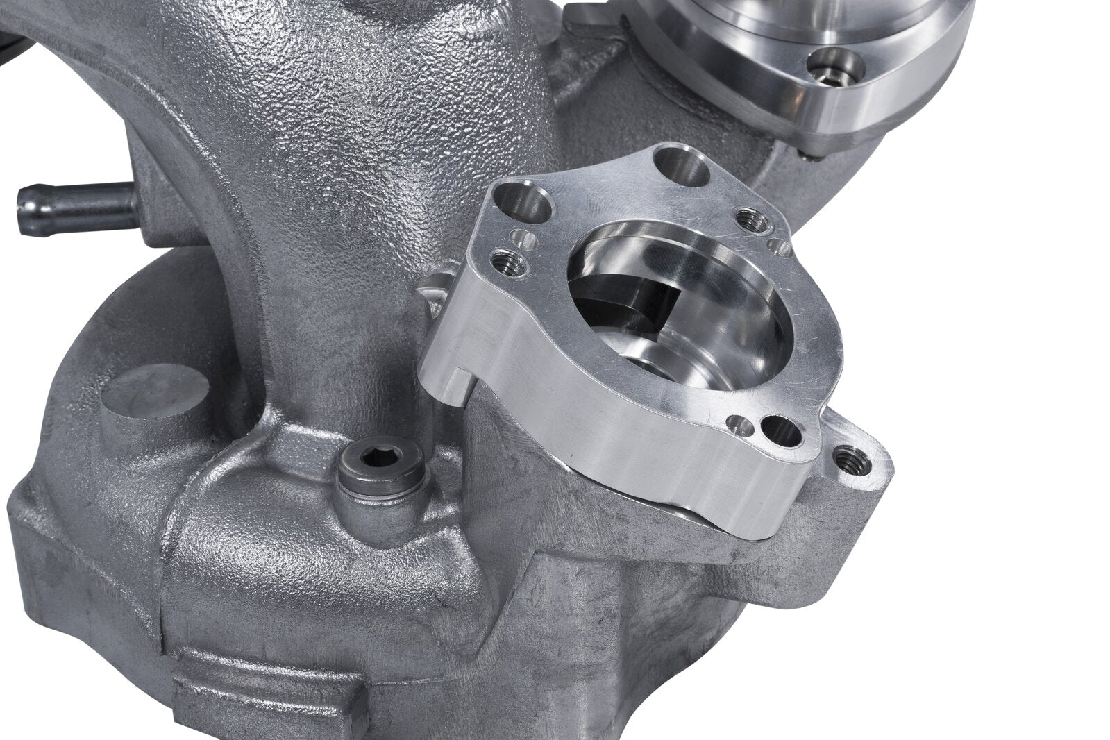 The OEM k04 turbocharger features a turbo muffler designed to reduce turbocharger sound in the cabin that also creates a restriction in the boost pressure delivery stream. APR removes the turbo muffler not only to enhance the sound of the turbocharger, but also to smooth the airflow across the previously baffled muffler section. This also eliminates the need to Purchase an OEM S3 turbo discharger pipe. A clean and simple CNC flange developed by APR's Engineering Team is bolted directly to the compressor cover in place of the OEM turbo muffler. A long mounting surface provides an excellent slip proof surface for mounting the silicon discharge hose and an o-ring between the flanges ensures a life of leak proof operation.