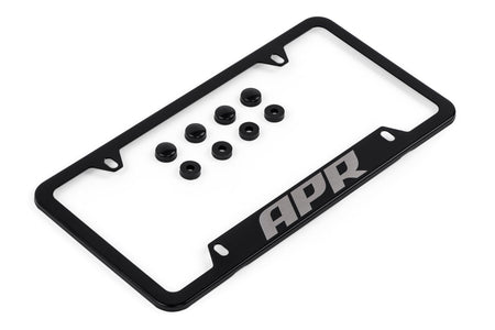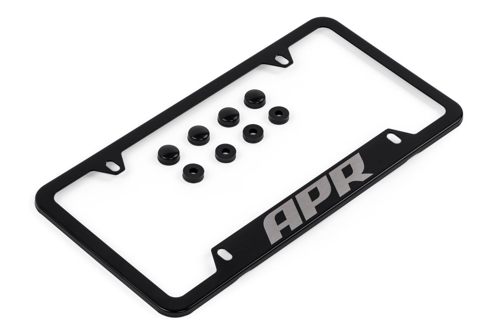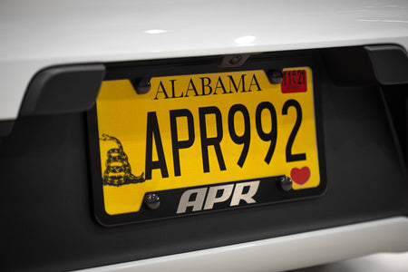 APR license plate frames and vanity plates are the perfect addition for any APR-tuned vehicle! They are made from sturdy and rust-resistant T304 stainless steel. They are thick enough such they won't flop around like throw-away handouts you find in a typical swag bag at car shows. They feature a fade and scratch-resistant black powder-coated finish with laser etching for the APR logo. Anti-vibration backside plate tabs keep it firmly in place. Four slotted install holes give you the perfect fitment with a solid connection to the car. The nice hardware hiders give it a clean finish too, hiding your unsightly plate screws. Fitment is universal, and the slimline plate is US DMV compliant. Some have said this product will increase the value of the vehicle, while others have made horsepower gains, but we can't comment on either.