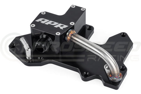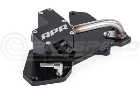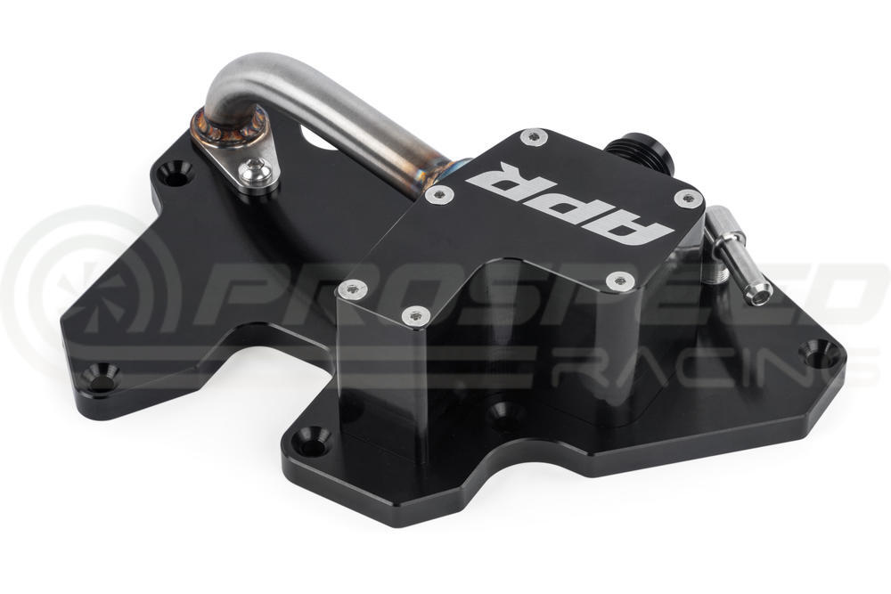 The APR PCV Top Plate is a factory-racecar-inspired-part that takes a multi-step approach to addressing several performance robbing issues, and critical engine safety concerns, with the factory system. This system include a new billet top plate that replaces the factory PCV with an upgraded unit designed to address various failure points. The system uses an internally baffled chamber to separate oil, and includes a stainless steel oil drain back port. We include new mounting pegs to lift larger full length engine covers out of the way to fit larger hoses, and include a one way check valve to prevent pressure from acting directly on the N80 valve. All fittings are -10 AN. This part is not a complete system as it's a replacement part for our existing MS100199 full catch can system.