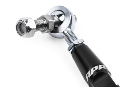 APR's Roll-Control Front Stabilizer Bar End Links improve handling and response through the use of replaceable and swappable spherical bearings, intended for race use. The end links offer a great range of adjustability in both connection geometry and height, allowing elimination of pre-loading and correction of stabilizer bar geometry. This is a necessary upgrade when altering the factory suspension components to allow correct operation and maximum performance.
