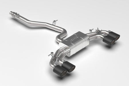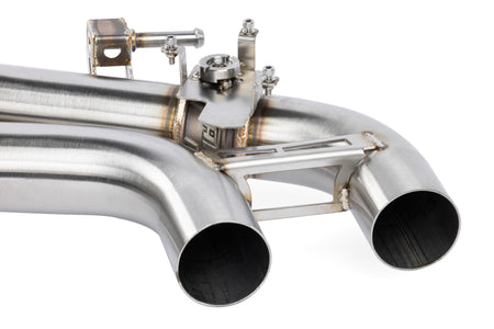 Our exhaust system uses larger piping compared to the factory exhaust system! We use 3" (76mm) OD piping, which then splits to duad 2.5" (63.5mm) piping. The factory system uses 2.76" (70mm) piping, which reduces to 2.56” (65mm) before entering the muffler. It then splits and exits the muffler as a quad 2.36” (60mm) system, but reduces down to 1.97” (50mm) just after exiting the muffler! These reductions greatly diminishing the overall cross-sectional area of the system. Internally to the rear resonator is our dual Helmholtz frequency eliminating chambers. With the valves open, exhaust gasses flow uninterrupted through the system, and when closes they travel through smaller pipes to reduce sound volume and cancel drone frequencies. Finally, our system’s 5.2x3.9” (131mm x 99mm) matte carbon fiber tips with stainless steel inlays eclipse the factory 4.6x3.46" (117x88mm) tips, giving the rear of the vehicle a sportier look.