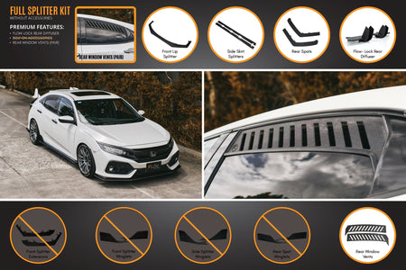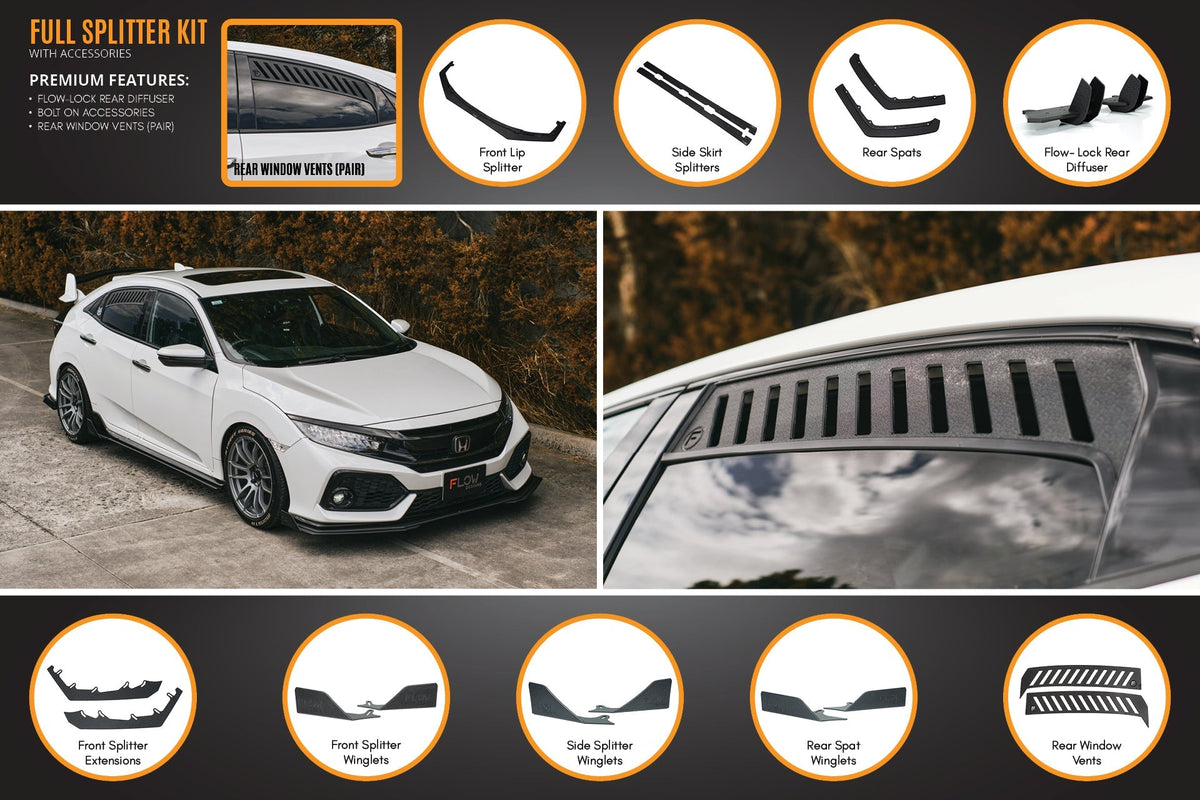 The FK4/FK7 Civic RS Hatch PFL body kit splitter set includes front lip splitter, side skirt splitters, Flow-Lock rear diffuser, rear spats and our full accessories range of front extensions and winglets all round. Easy installation instructions are included - we guarantee our FK4/FK7 Civic RS Hatch PFL body kit splitter set is the most durable on the market and will complete your exterior aesthetic by giving it a more aggressive look!