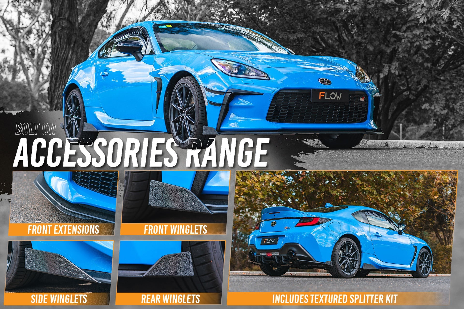 The new Flow Designs splitter set for the Toyota ZN8 GR86 offers a gloss or textured finish and includes front/side splitters & rear spats/Flow-Lock rear diffuser. Pre-pressed in threaded brass inserts accept all our add-on accessories for the ZN8 such as winglets and front splitter extensions.