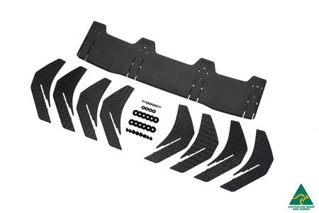 Valance is installed to the car through bolts and nuts while the Flow-Lock diffuser fins simply click into the valance (once locked into the valance it is secure). It is also possible to install when your car is on the ground.