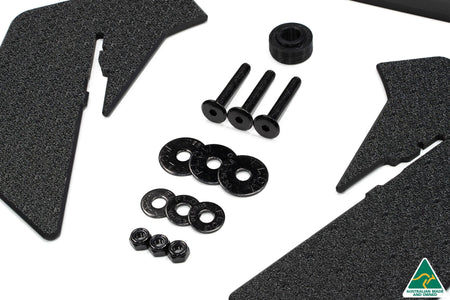 Valance is installed to the car through bolts and nuts while the Flow-Lock diffuser fins simply click into the valance (once locked into the valance it is secure). It is also possible to install when your car is on the ground.