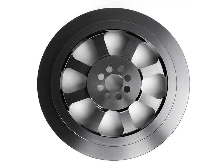 Weighing in at only 2025 grams, IE engineers have produced a robust pulley while trimming as much fat as possible without risking the structural design. The aluminum construction is 49% lighter than the stock setup, reducing rotating mass, resulting in faster engine revs and less parasitic loss.