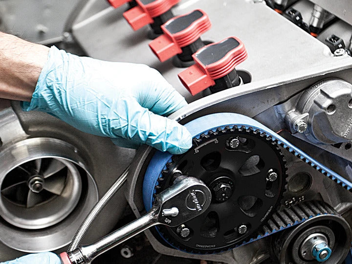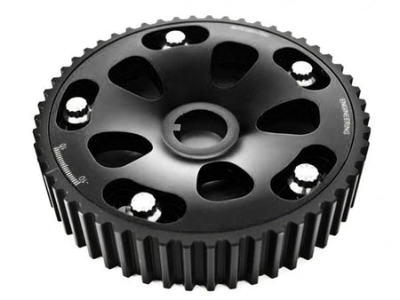 IE's Adjustable Cam Gear allows you to finely tune the power band of your engine by advancing or retarding your cam timing. This adjustment allows you to dial in whatever cams you have to the setup you are running for peak power. Each cam gear is precision CNC machined from solid 6061 aluminum, and features a real one piece male keyway for an exact OE fit. The cam gear outer rings are machined to OE specifications for a perfect mesh with your timing belt and then hard anodized for wear. The threads are roll form tapped to create the toughest threads available, and then stuffed with high quality stainless ARP bolts to lock it all together. Finally, a flawless layer of bright dip anodizing is interrupted only by the crisp laser etching which ensures you can always know exactly where your cams are positioned.