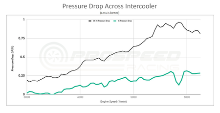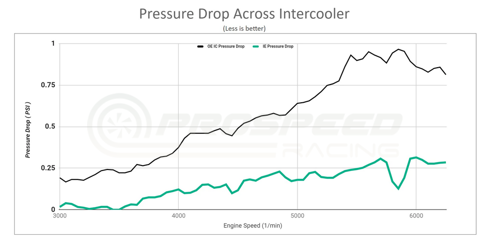 Along with lower intake air temperatures, the large core within the IE intercooler also decreases pressure drop compared to the factory unit. Simply put, pressure drop is the amount of pressure that is lost as air travels through the intercooler. As airflow boost pressure is raised, pressure drop typically begins to climb. Using a larger core that flows much more freely than the factory core, the pressure drop is reduced, decreasing the need for the turbocharger to work harder to produce the required boost levels. This allows the turbocharger to deliver more usable boost pressure to the engine. (See dyno chart in power charts tab)