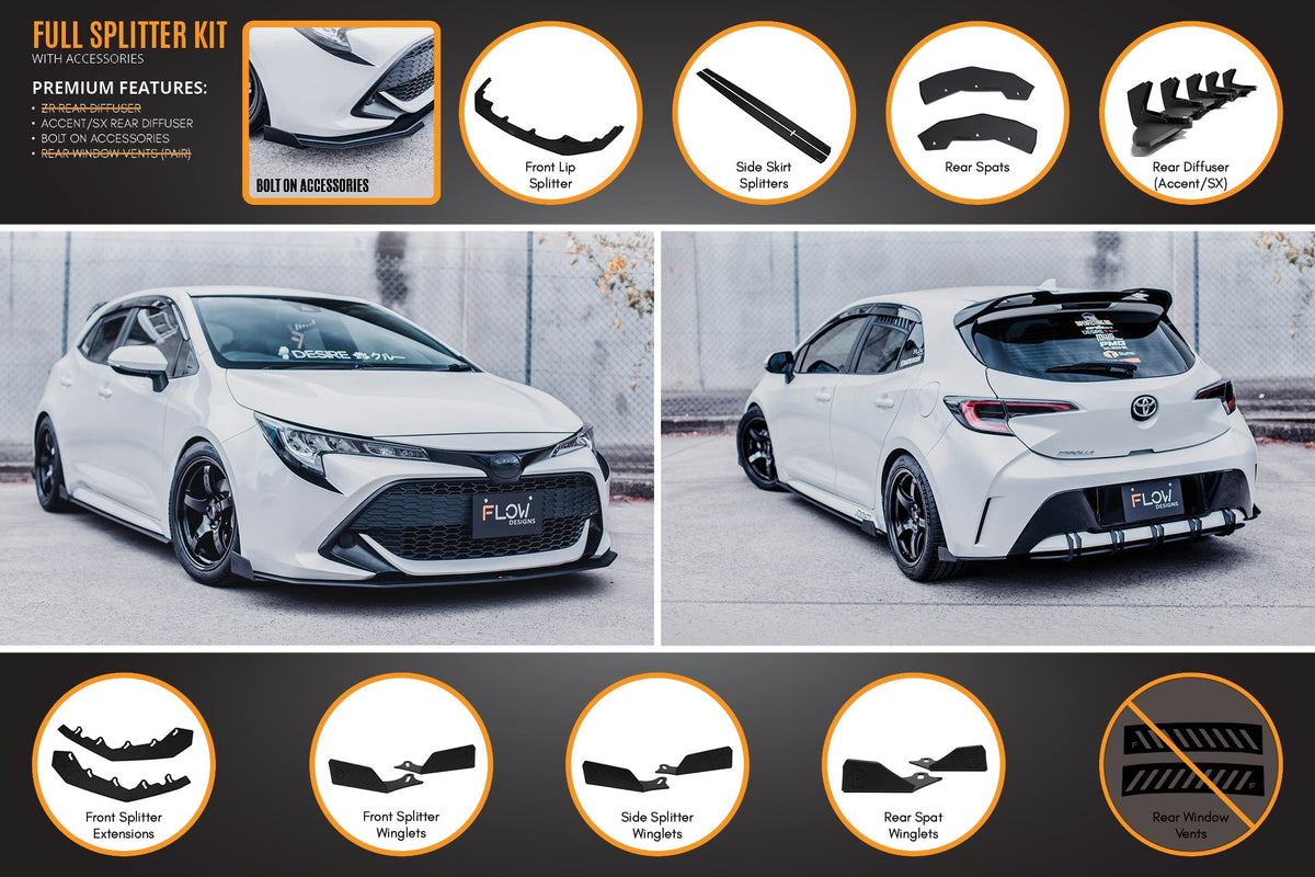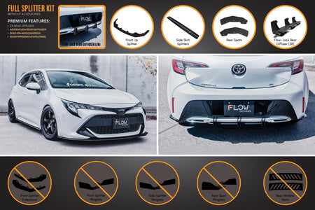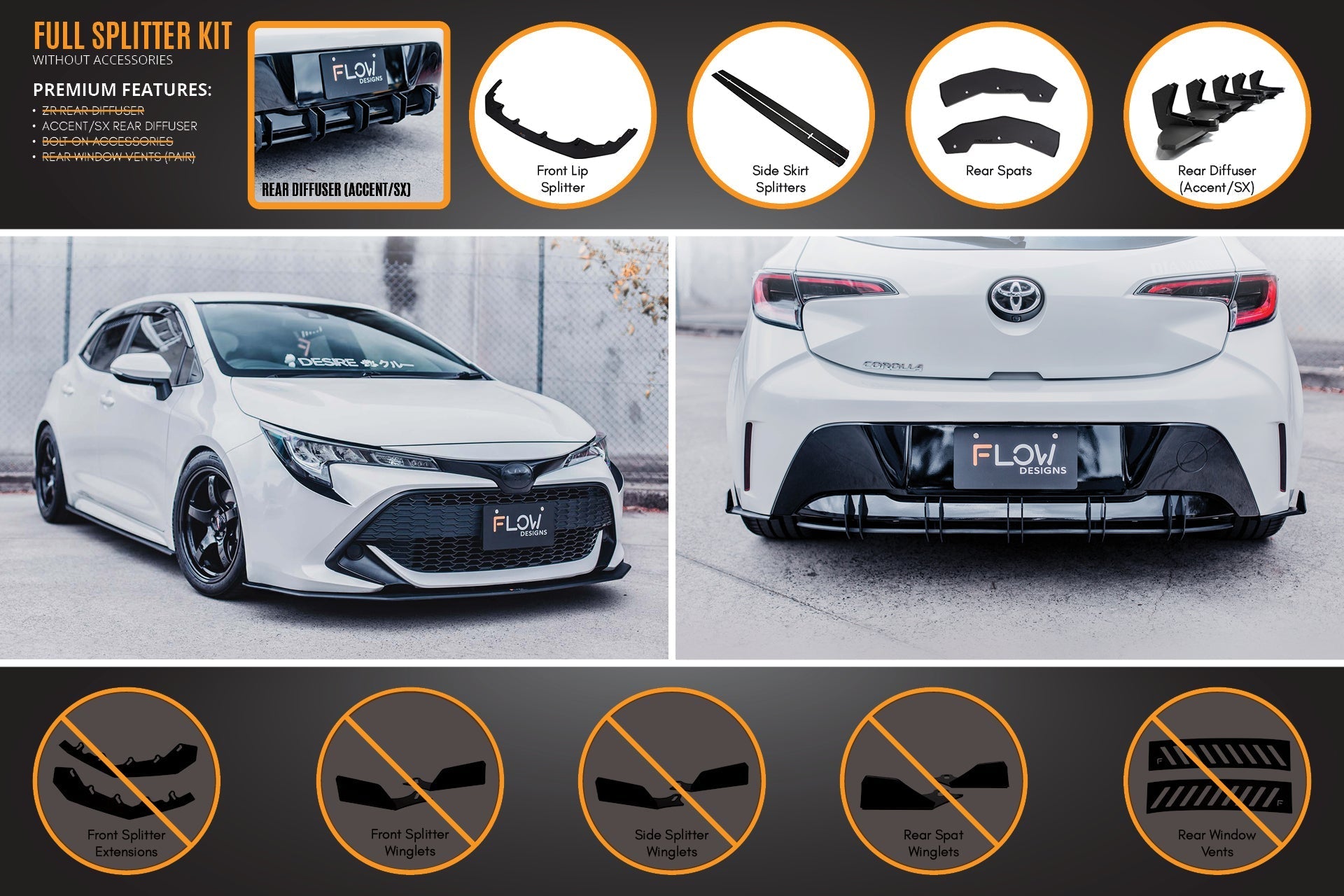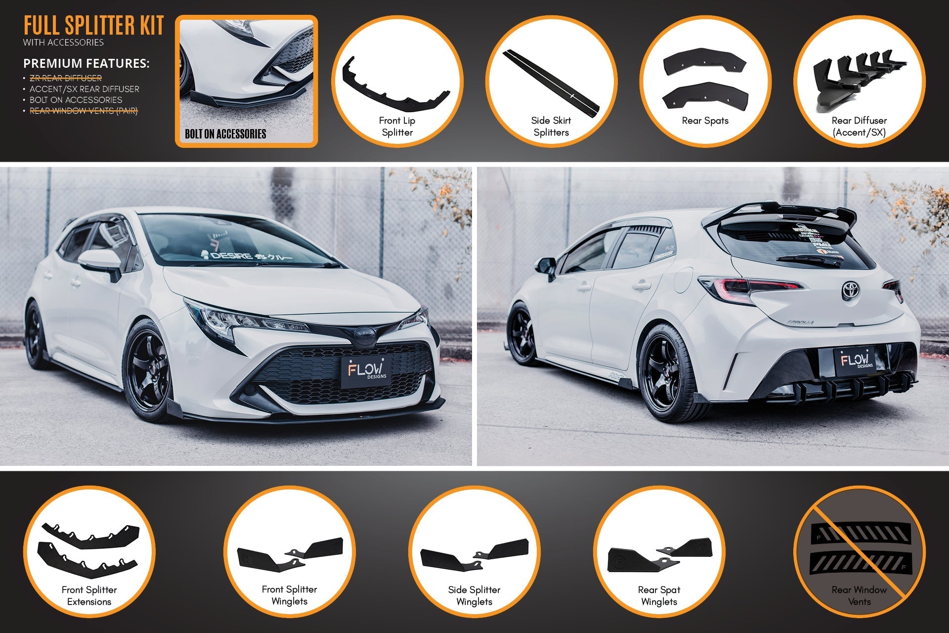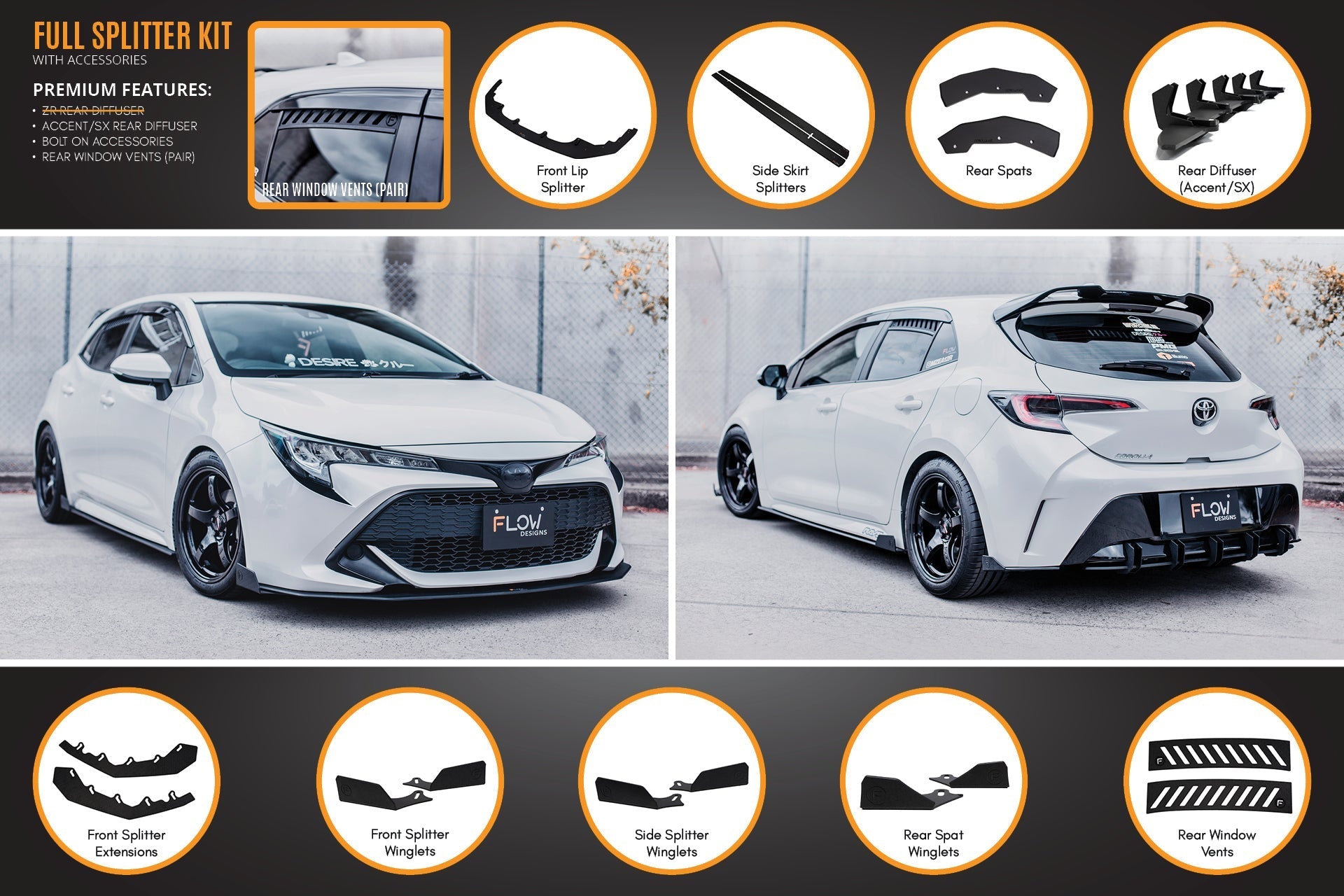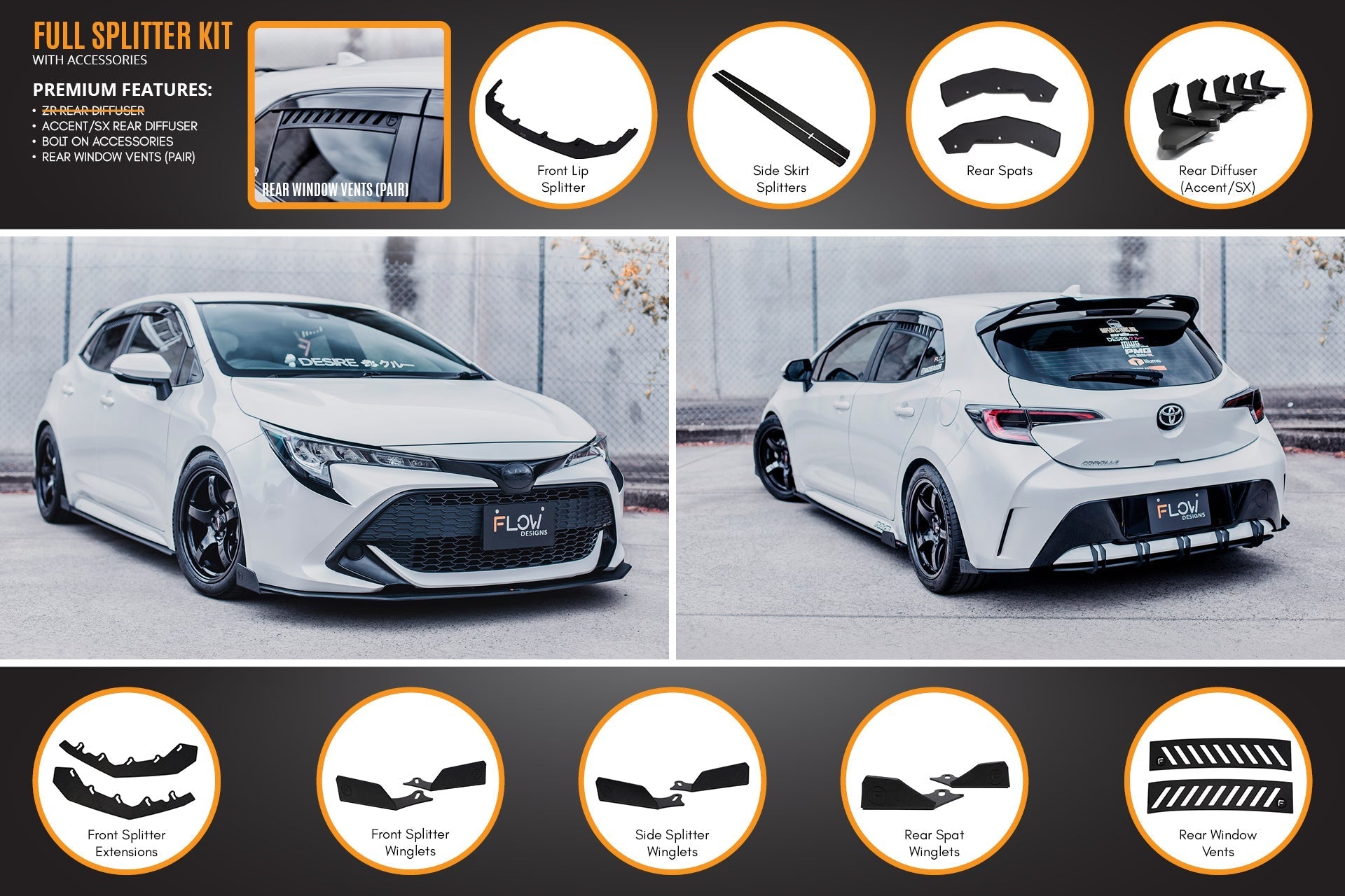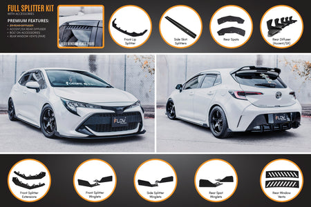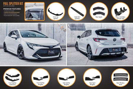 The Corolla MZEA12R/ZWE211R 2018-2022 body kit splitter set includes front lip splitter, side skirt splitters, Flow-Lock rear diffuser and if you choose includes rear pods/spats and our full accessories range of window vents, front extensions and winglets all round. Easy installation instructions are included and does not require bumper removal. We guarantee our MZEA12R/ZWE211R 2018-2022 body kit splitter set is the most durable on the market and will complete your exterior aesthetic by giving it a more aggressive look.