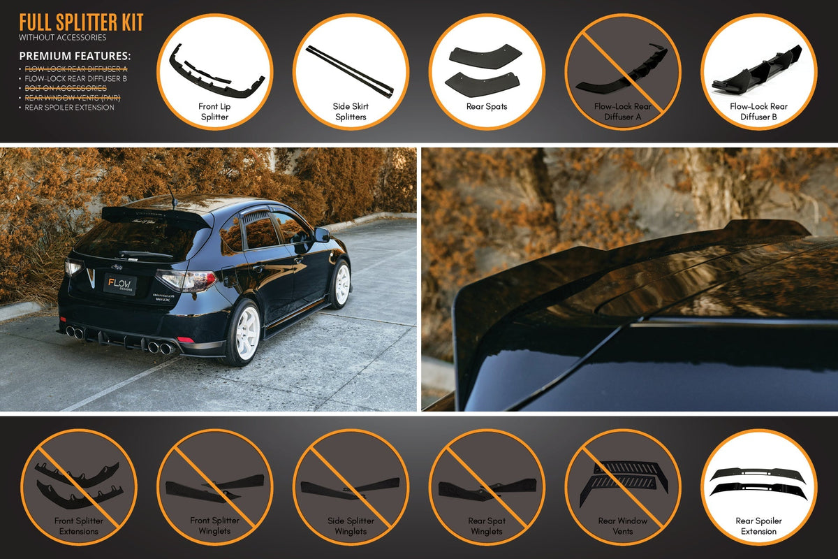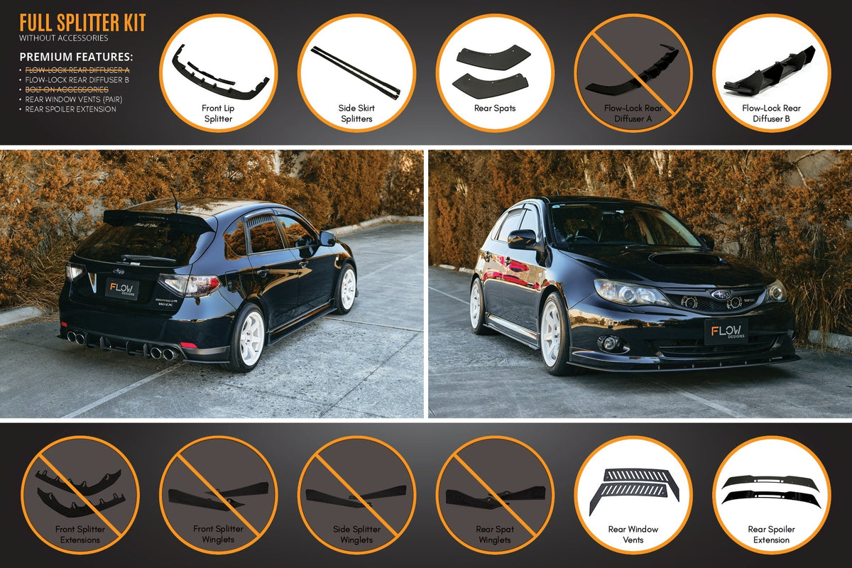 The Subaru Impreza WRX/RS G3 Hatch PFL full lip splitter set includes front lip splitter, side skirt splitters, Flow-Lock rear diffuser (option A or B) and bolt on accessories for both WRX G3 & RS G3 Hatch (narrow body) models. Easy installation instructions are included and the WRX/RS G3 Hatch PFL range does not require bumper removal. We guarantee our WRX/RS G3 Hatch body kit splitter set is the most durable on the market and will complete your exterior aesthetic by giving it a more aggressive look.